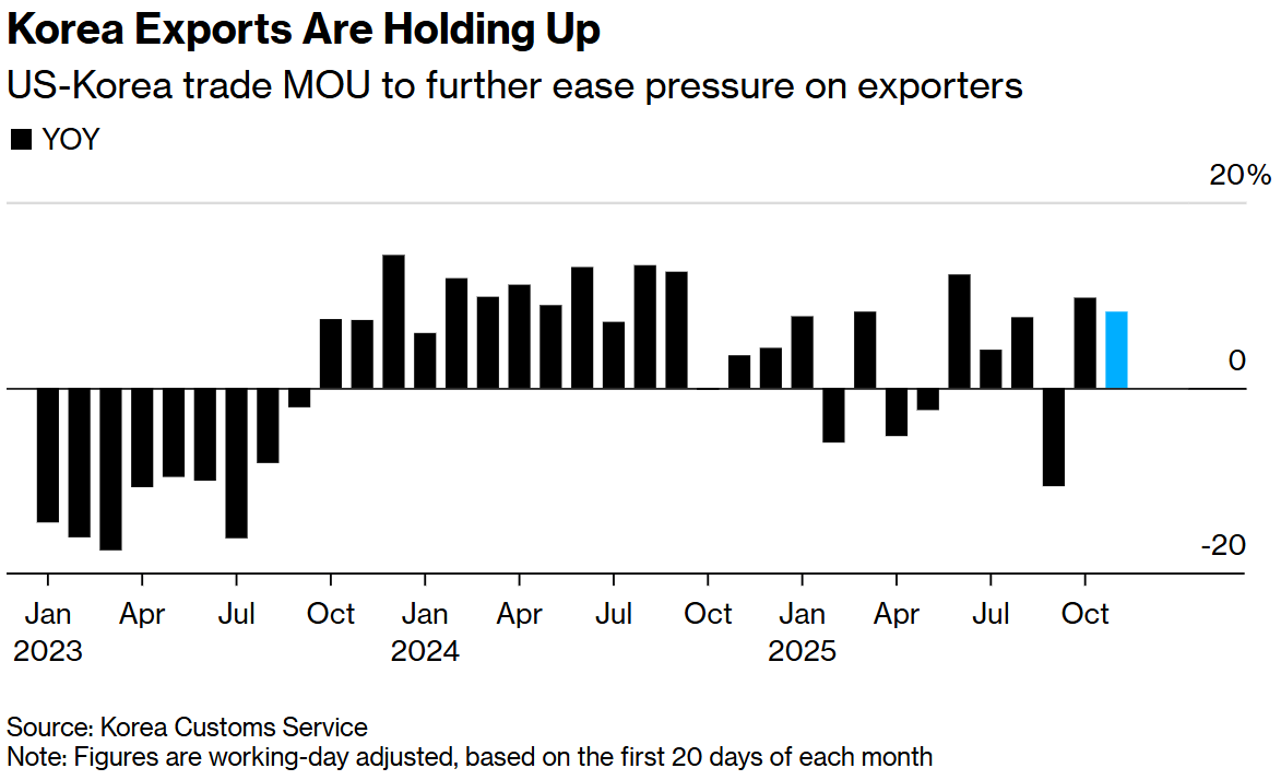 这些数据为韩国央行在11月27日政策会议前提供了对韩国出口状况的最新解读。一些经济学家预计央行将维持利率不变,因为委员会正在关注美韩协议效果的滞后影响,同时警惕国内家庭债务和房地产风险。