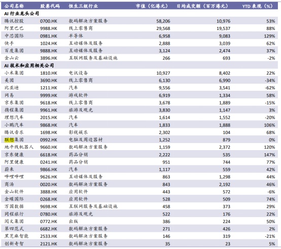 基于此,浦银安盛,梳理出 24 个短期有望受到资金青睐的 AI 技术和应用相关的港股公司,供投资者参考: