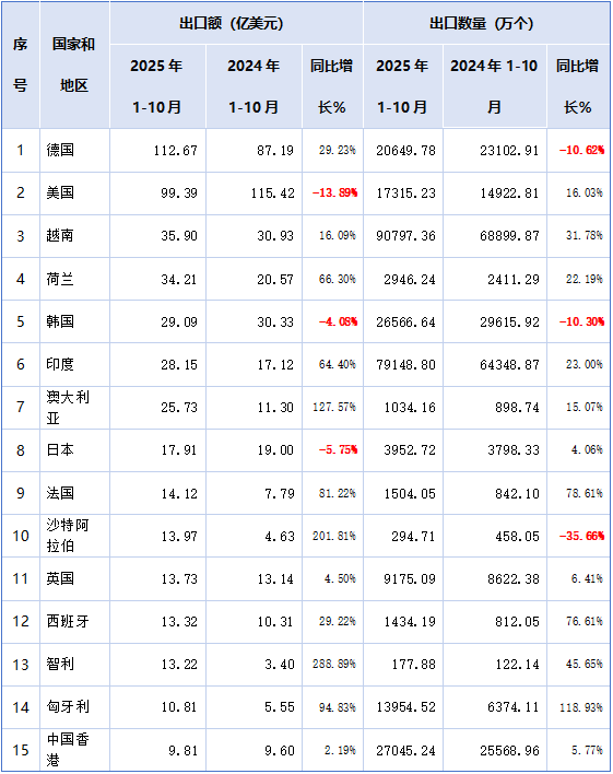 表三2025年1-10月锂离子电池出口额前15大目的地变化情况