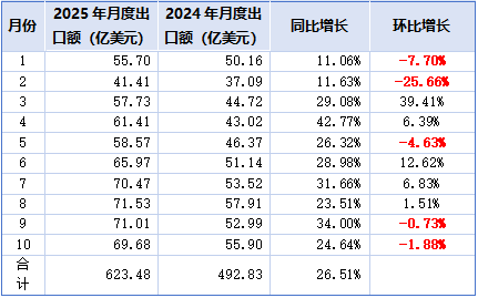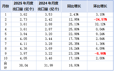表一2025年1-10月锂离子电池出口量月度变化情况