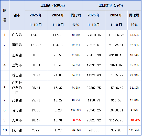 表四 2025年1-10月锂离子电池出口额前10大省市变化情况