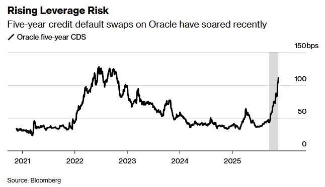 投资者的担忧在相关金融衍生品上体现得淋漓尽致——反映杠杆风险的甲骨文五年期信用违约互换(CDS)已飙升至三年来的最高水平。对此,Easterly EAB全球宏观策略师Arnim Holzer表示:“看到甲骨文的CDS上升不应该令人惊讶。这些公司正在投入巨额资金并承诺进行巨额资本支出,其中一部分将通过债务融资。这并不意味着甲骨文的股票是垃圾,但它应该会波动更大。”