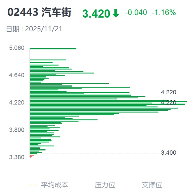 11月21日,汽车街(02443)盘中股价最低触及3.38港元,这预示着其在近期连续的下跌行情中,离刷新上市股价新低又近了一步。