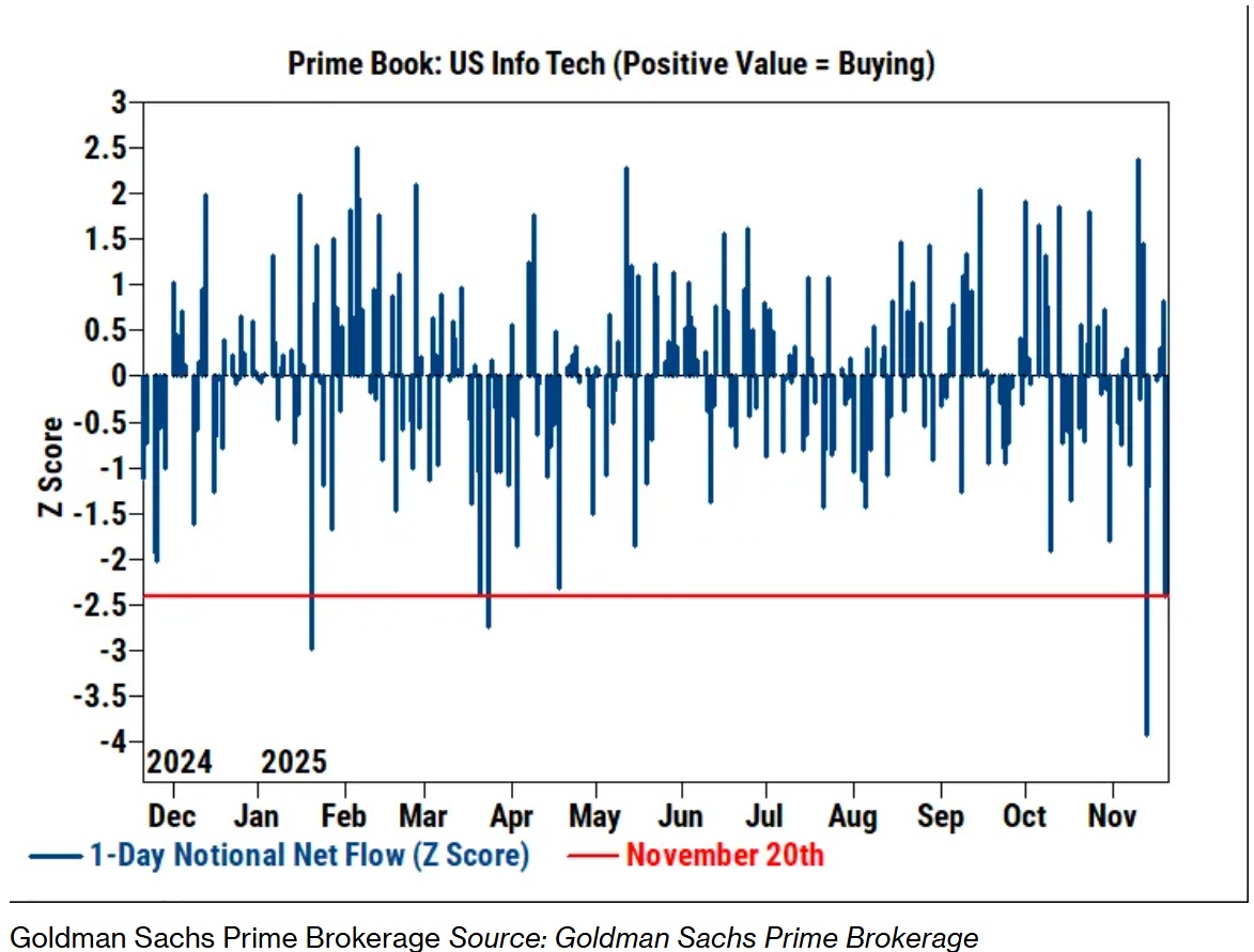 除了宏观对冲手段(如建立ETF和指数的空头头寸)外,对冲基金还削减了个股头寸。高盛尤其注意到科技股出现投降迹象,该板块在周四的暴跌中首当其冲。去杠杆化几乎波及该行业各个角落,其中以半导体、半导体设备股和软件公司为首。