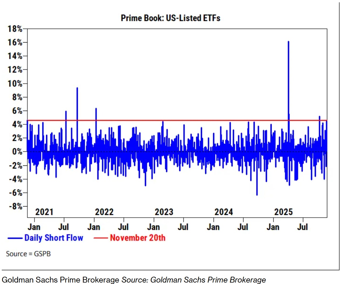 高盛的主要经纪业务数据显示,周四美国交易所交易基金的净空头头寸猛增4.6%,创下今年第五大单日增幅,也是过去五年来的最大增幅之一。