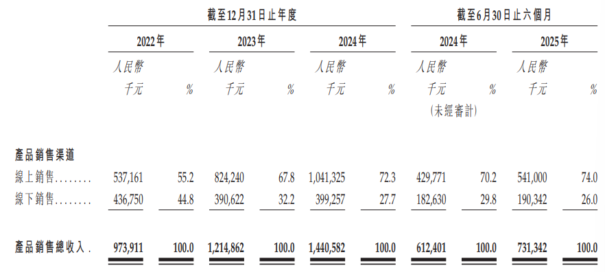 而就销售渠道来说,蔓迪国际已经建立了覆盖线上及线下的完善的销售网络。2022年-2025年上半年,公司的线上渠道销售表现尤其突出,收入占比分别为55.2%、67.8%、72.3%、74%,为蔓迪国际贡献了可观的增量收入。另外值得一提的是,报告期内蔓迪国际的所有收入均于国内市场产生。