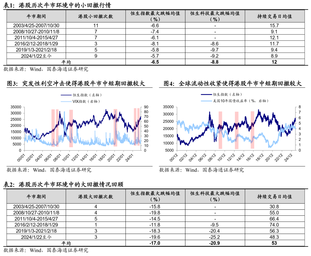 牛市中市场出现调整很正常。根据牛市中的调整幅度大小,我们把港股牛市中的调整分为两类,第一类是小回撤,最大跌幅约7%,主要源于短期市场情绪扰动;第二类是大回撤,最大跌幅约17%,主要与流动性转向、突发冲击等因素有关。