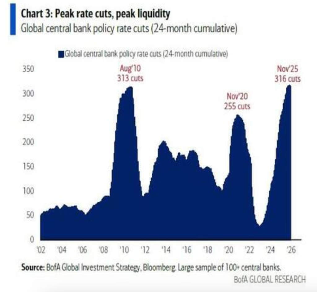 Hartnett预期,当前美股银行股的疲软正释放出与2018年12月相似的信号,流动性敏感板块的持续下跌或将迫使美联储转向宽松政策。回顾2025年,全球央行累计316次降息已催生了一场流动性盛宴,直接推动了AI投资狂热、日股剧烈波动与加密货币投机三大市场现象。