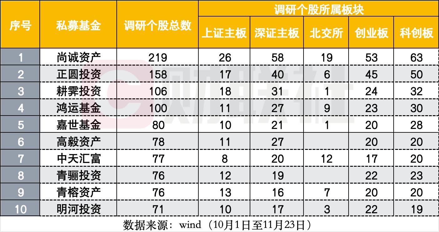 在私募调研的这2张榜单上,尚诚资产均占据榜首,10月来共调研228次、调研219只个股,是该一阶段调研总次数超200次、调研个股超200只的唯一私募。