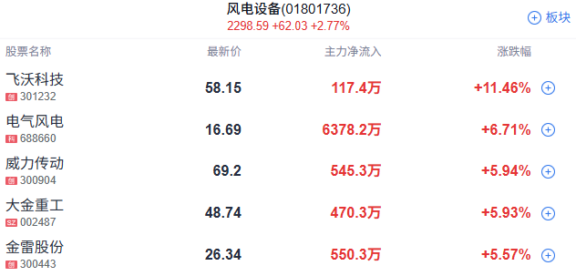 风电设备板块表现活跃,飞沃科技涨近11%,大金重工涨超6%。