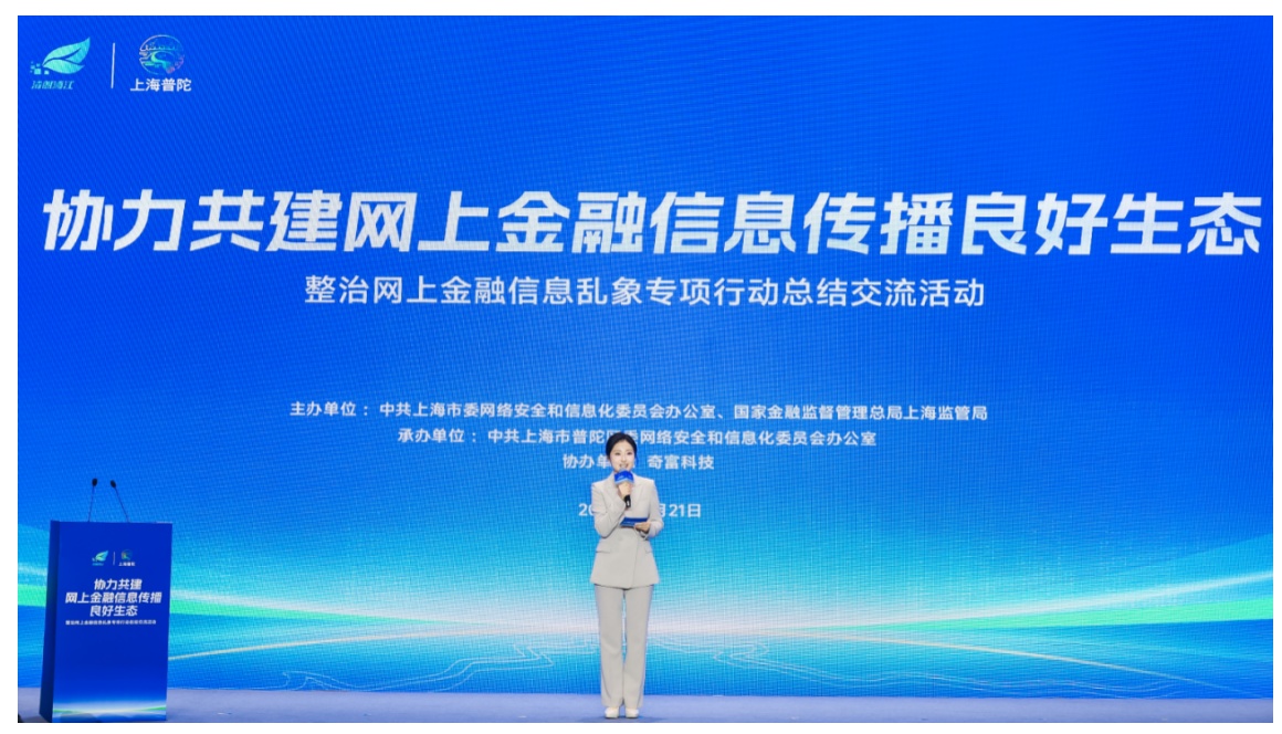 11月21日,由上海市委网信办、上海金融监管局联合主办,普陀区委网信办承办,奇富科技(QFIN.US)协办的“清朗浦江·e企共治”整治网上金融信息乱象专项行动总结交流活动,在半马苏河国际会议中心举行。来自监管、网络平台、金融机构等代表齐聚一堂,以“协力共建网上金融信息传播良好生态”为主题,共话治理经验、协商共治良策。国家金融监管总局金融消保局副局长向巴泽西,上海市委网信办主任范小伟,上海金融监管局局长綦相,普陀区委书记胡广杰,上海金融监管局副局长曹光群,上海证监局副局长王登勇,普陀区委常委、副区长李荣华等出席活动。