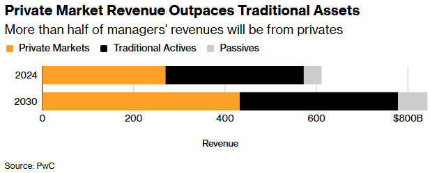 这家咨询公司发现,到2030年,资产和财富管理行业将从私募资产中获得约4320亿美元的收入,超过传统主动管理投资和被动产品的收入总和。普华永道的数据显示,2024年,私募资产占总收入的44%,而传统投资构成了行业总收入的大部分。