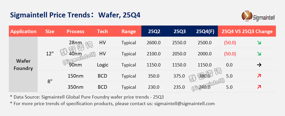 在本土替代需求支持下,中国大陆晶圆代工厂产能利用率在2025年保持健康。2026年起,国际客户与中国本土代工厂合作的产业链布局需求逐步落地,预计中国大陆晶圆厂在28/40nm制程的产能利用率将在2026年接近满载。预计28/40nm整体价格在2025年四季度将保持稳定。在HV应用方面,中国大陆晶圆厂价格此前已处于低位,调整空间有限,而台系/美系代工厂价格则仍在下调,带动整体价格继续下滑。