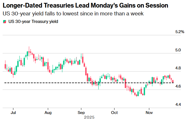 投资者的关注点仍集中在美联储 12 月 10 日的决策上。此前,纽约联储主席威廉姆斯上周表示,他认为在“短期内”还有进一步降息的空间。美联储理事沃勒周一与威廉姆斯意见一致,主张在 12 月进行降息,随后从 2026 年起采取更为灵活的政策。据报道,旧金山联储主席戴利也表示支持降低利率。