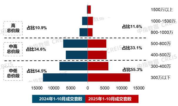 从成交总价结构看,400万以下产品成交套数占比55.3%,较2024年同期提升0.8个百分点。400-800万产品成交套数占比33.1%,较2024年同期下降1.5个百分点。800万以上产品成交套数占比11.6%,较2024年同期提升0.8个百分点。