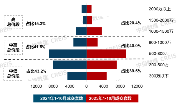 从成交总价结构看,500万以下产品成交套数占比39.5%,较2024年同期下降3.6个百分点。500-1000万总价段产品成交套数占比下降至40.0%。1000万以上产品成交套数占比20.4%,较2024年同期提升5.1个百分点。