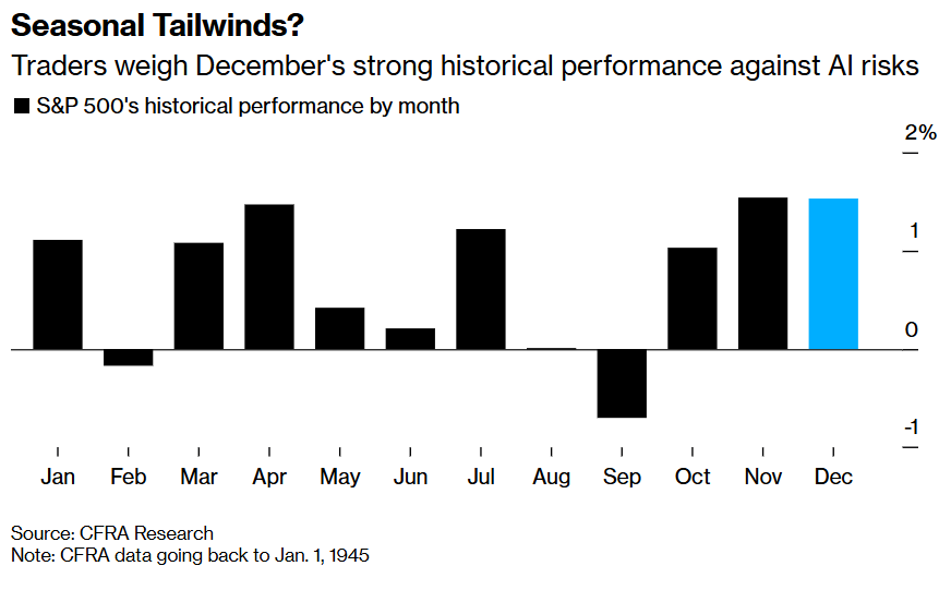 季节性顺风主导市场?正如上述图表所显示的那样,交易员们正在积极权衡12月强劲的股票市场历史表现与AI风险。