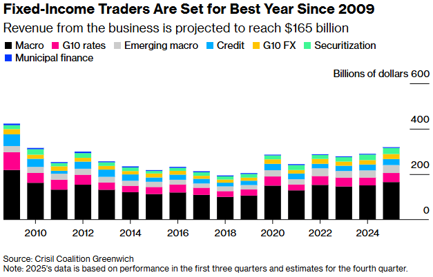 根据Crisil Coalition Greenwich的数据,高盛集团、摩根大通和花旗集团等公司今年预计将从固定收益、信贷和大宗商品交易中产生1650亿美元的收入,较2024年增长10%。