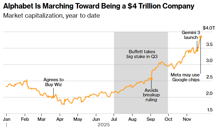 而且,有迹象表明,对谷歌专门研发的人工智能芯片的需求正在上升,这是目前少数能够与英伟达(NVDA.US)主导的产品相抗衡的替代方案之一。周一有报道称,Meta (META.US)正在商讨使用谷歌的芯片。自 10 月中旬以来,谷歌母公司Alphabet的市值已增加了近 1 万亿美元,这得益于沃伦·巴菲特在第三季度购入了 49 亿美元该公司股份,以及华尔街对其人工智能业务的普遍看好。该公司目前的市值接近 4 万亿美元。