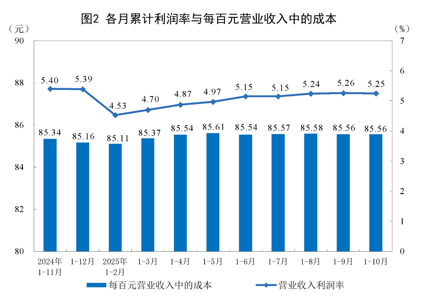 1—10月份,规模以上工业企业每百元营业收入中的成本为85.56元,同比增加0.17元;每百元营业收入中的费用为8.37元,同比减少0.10元。
