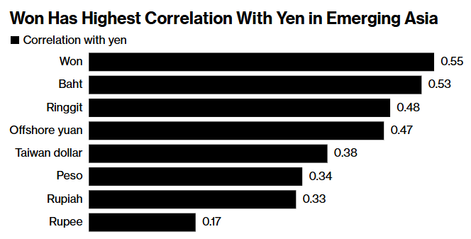 根据过去五年的每周数据统计,韩元与日元的关联度在过去一周已升至 0.55,当该数值为 1 时意味着两种资产会同步变动。而韩元与人民币的这一关联度则为 0.48。