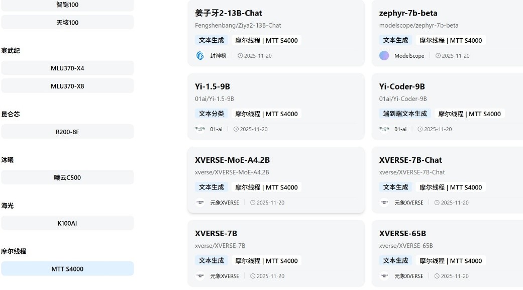 模型生态丰富多元:已覆盖从通用大模型、垂直领域模型到前沿创新模型的多元化品类,并广泛支持华为昇腾、寒武纪、天数智芯、昆仑芯、摩尔线程、沐曦、曦望等主流国产算力。