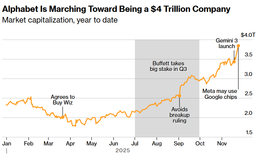Gemini3震撼全球,再叠加“股神”巴菲特“最后一舞”建仓谷歌母公司Alphabet即位列伯克希尔前十大重仓股,不仅这家谷歌母公司股价步入暴涨曲线且屡创历史新高——自10月中旬以来大涨超35%且市值开始逼近4万亿美元超级关口,博通、Lumentum、台积电以及MongoDB等谷歌AI生态链的重要参与者们股价均进入屡创新高的狂野暴涨模式。