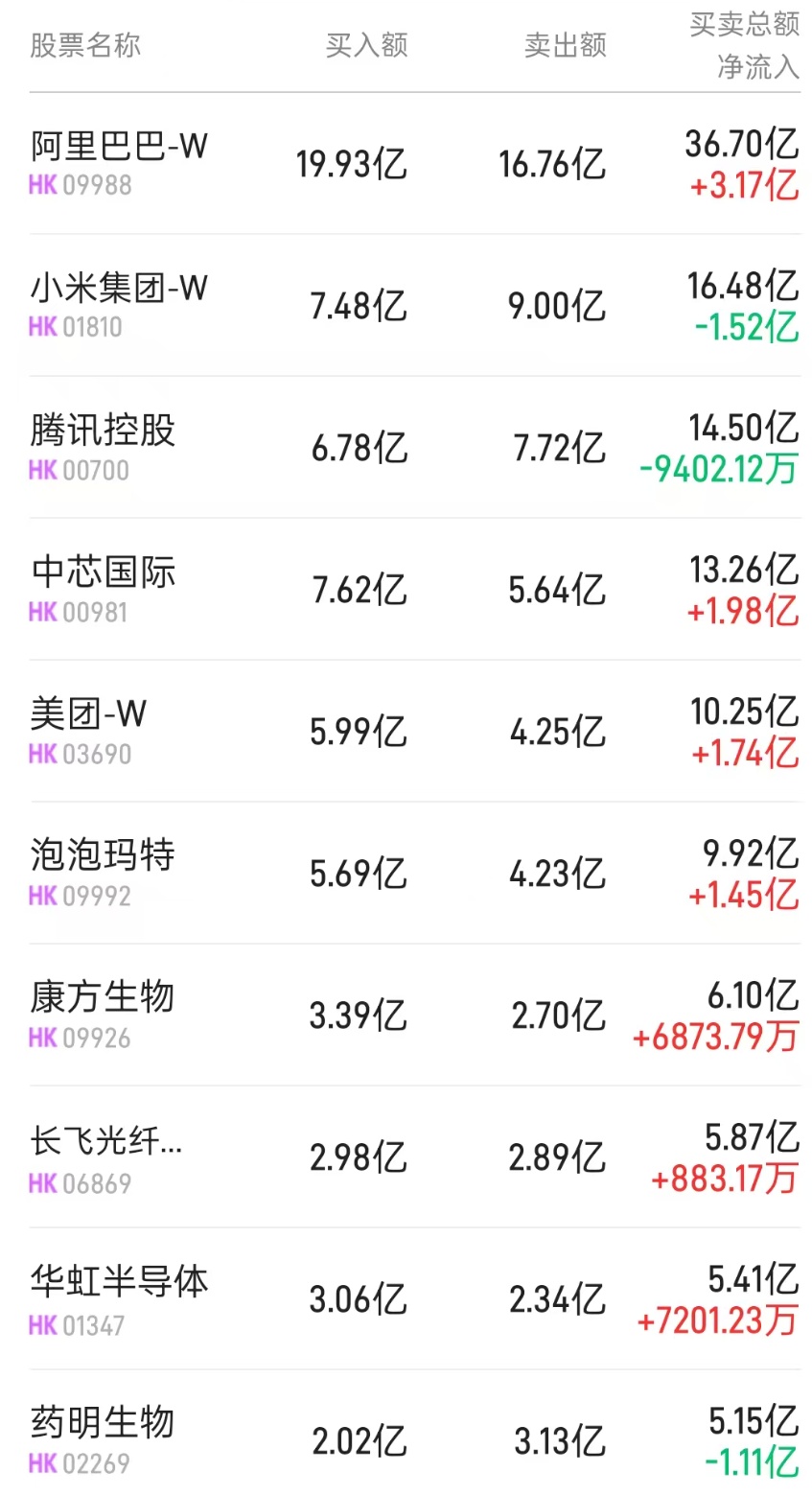 美团-W(03690)获净买入3.25亿港元。消息面上,阿里巴巴集团CFO徐宏表示,三季度是闪购业务投入高点,随着整体效率的显著改善和规模稳定,预计闪购业务的整体投入会在下个季度显著收缩。当然,阿里也会根据整个市场的竞争状态,动态调整投资策略。有分析人士指出,阿里以上的表态,或意味着“暂时休战”。