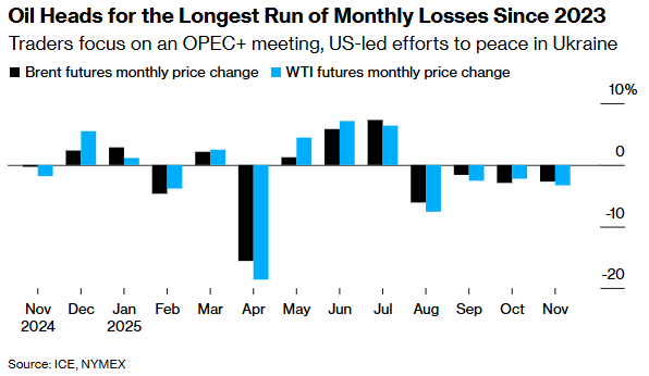 WTI原油期货价格徘徊在59美元/桶附近,略高于感恩节假期前周三的收盘价;布伦特原油期货结算价维持在63美元上方。美国原油基准合约11月料将录得连续第四个月下跌,这将是自2023年第一季度以来最长的月度下跌周期。
