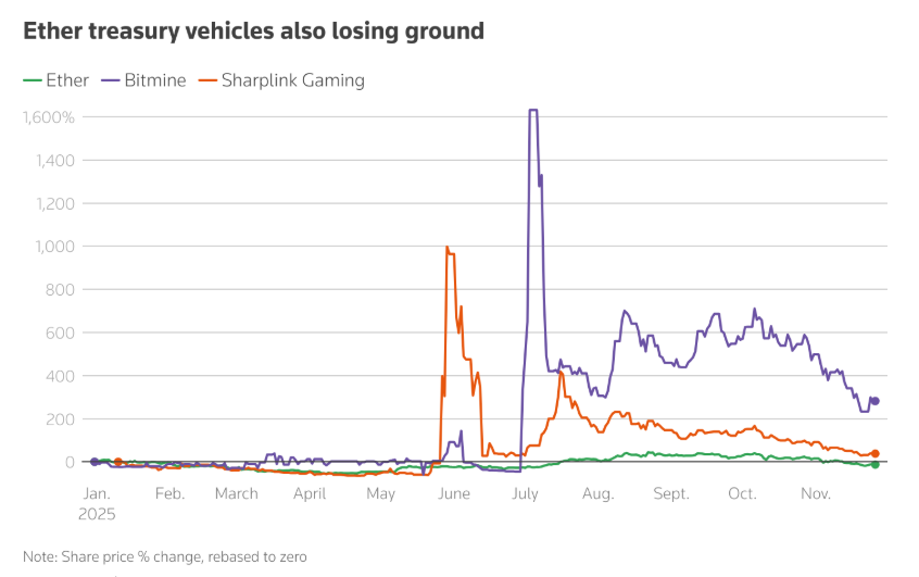 上述的折线图展示了今年以太坊价格与以太坊金库公司股价的对比走势。