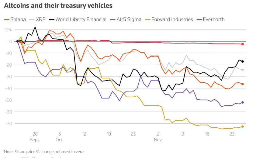 一些中小型加密货币金库公司还拓宽了其持仓范围,将Solana和Ripple的XRP等“替代币”(altcoins)纳入其中。