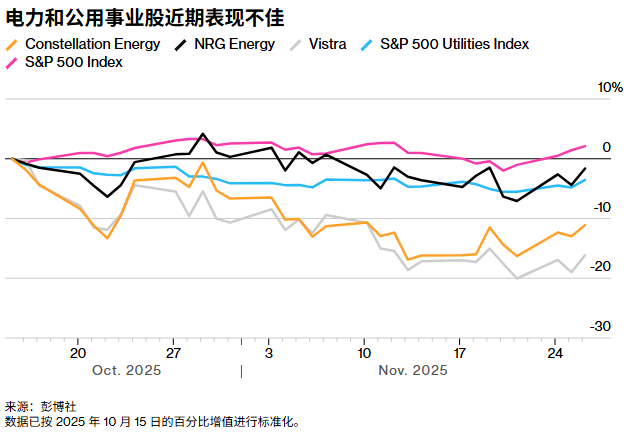 Constellation Energy(CEG.US)在第三季度财报电话会议后,股价从10月高点下跌11%,因会议未披露任何新建发电项目细节。杰富瑞一位分析师的报告标题写道:"无数据中心交易"。同样,Vistra Energy(VST.US)自10月中旬以来下跌16%,因分析师注意到其数据中心项目公布速度慢于预期。