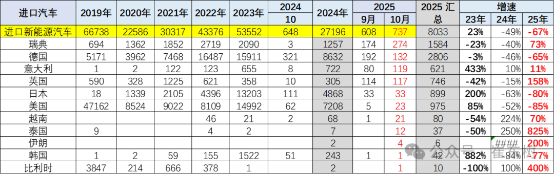 2024年国产车竞争力较强,进口主力国家的新能源车进口下滑67%。2025年的进口新能源乘用车压力进一步加大,美国进口车很差,欧洲进口新能源还有一点销量。