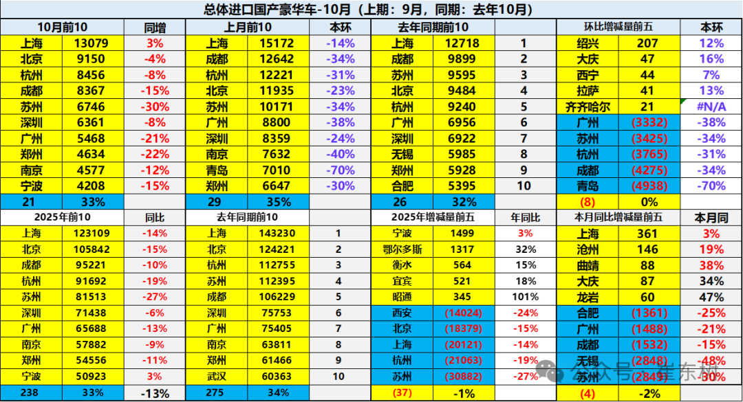 今年10月的超豪华市场有所改善,劳斯莱斯和法拉利等进口车表现较好,上海地区超豪华需求明显回升。豪华车市场压力较大,苏州、杭州、上海、深圳、北京、重庆等传统富裕地区的表现一般。今年的宁波、鄂尔多斯豪车较强。