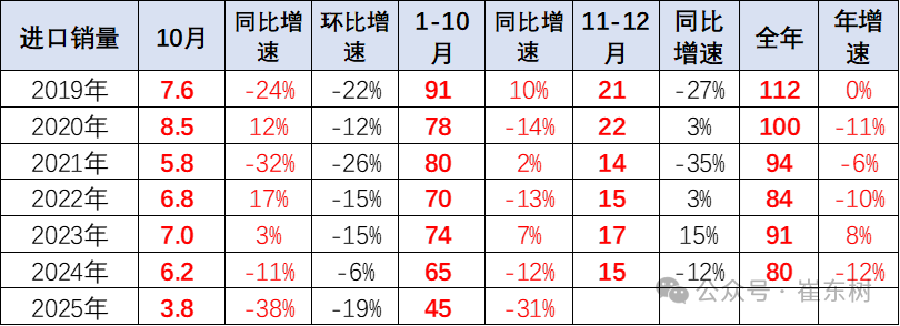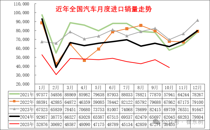 智通财经APP获悉,崔东树发文称,2025年1-10月进口汽车40万辆,同比下降30%,这是近期少见的1-10月巨大下滑。其中10月进口车4.3万台,同比下滑0.5%,环比9月增6%。进口车在2014年进口车达到143万辆峰值后下行, 2024年进口规模持续锐减,全年进口仅有70万辆,同比下降12%。目前2025年1-10月进口汽车40万辆,突破50万的难度较大。2025年1~10月份,进口美国车辆降到42465辆。同比下降53%的水平,而10月份美国车进口729辆,环比降50%,同比下降83%。