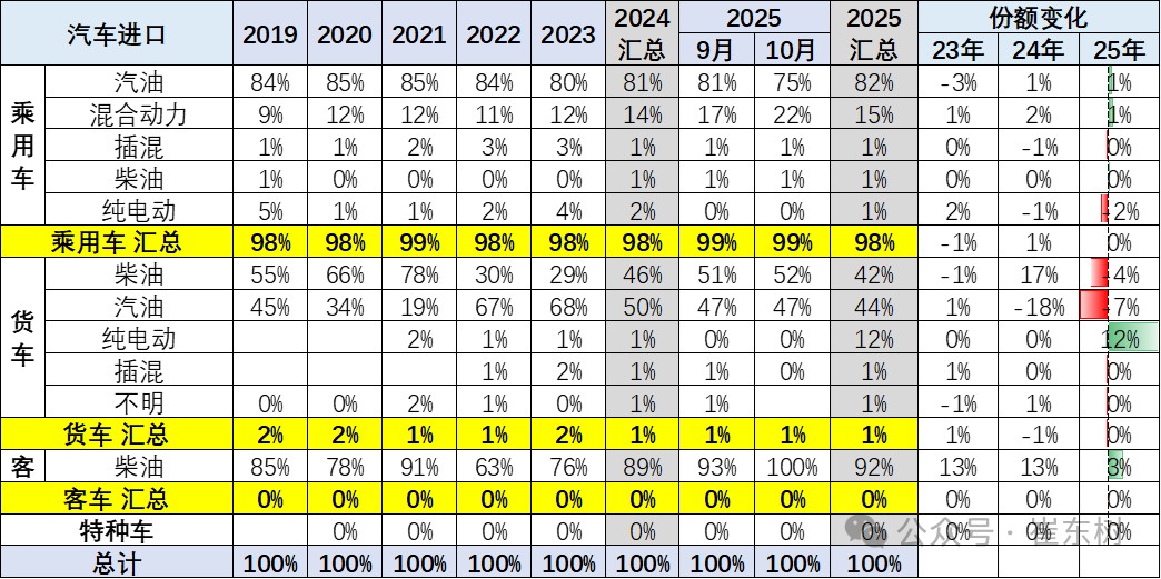 2024年进口乘用车新能源进口占比达到3%,2025年1-10月进口新能源车占比下降到2%,纯电动较去年有小幅下降,燃油乘用车仍是绝对主力。货车中的汽油车比例仍是较高的,但柴油车提升较好。