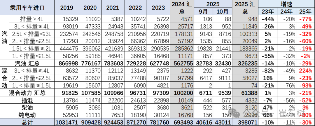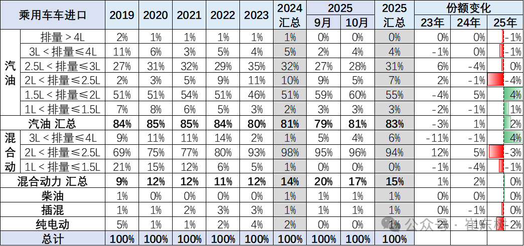 乘用车的进口车型排量原本集中于2升以下汽油车型,2025年1-10月占比整个汽油车的进口量58%的比例,较去年增加5个点。