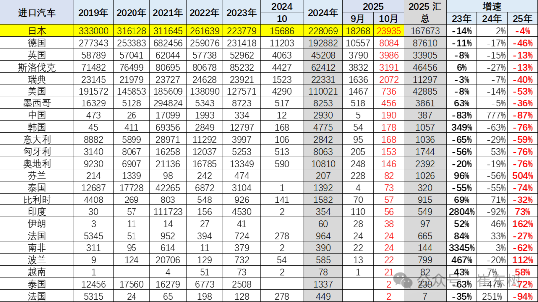 2025年1-10月进口最高的前10国家是:日本167616辆、德国87503辆、斯洛伐克46456辆、美国42465辆、英国33902辆、瑞典11203辆、墨西哥3846辆、奥地利2390辆、匈牙利1739辆、韩国1036辆。其中本期较同期增量增大的前五个是:芬兰670辆、西班牙297辆、印度232辆、伊朗60辆、马来西亚56辆、