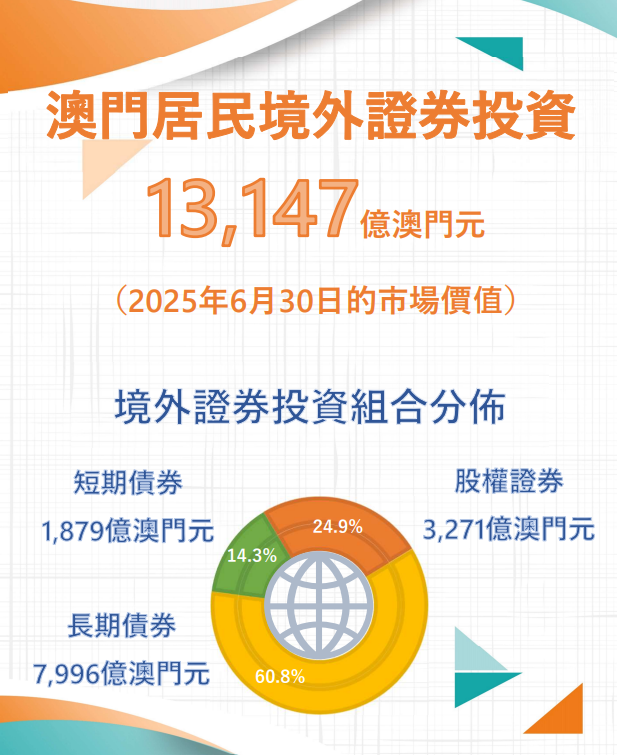 智通财经APP获悉,澳门金融管理局发布的统计显示,在2025年6月30日,澳门居民持有由境外无关连实体发行的证券投资,以当天市场价值计算为13,147亿元(澳门元,下同)。在各类证券投资中,股权证券、长期债券及短期债券的市值分别为3,271亿元、7,996亿元及1,879亿元。