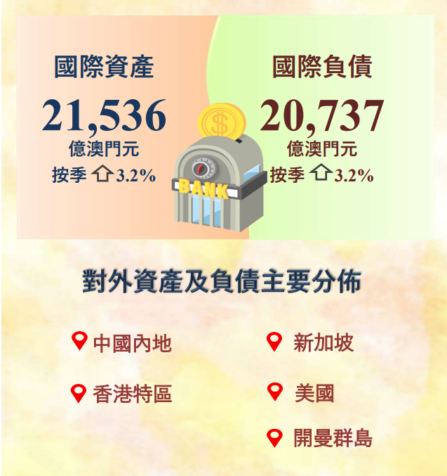 至2025年9月底,国际性业务占澳门整体银行业务的比重按季保持平稳。国际资产占银行体系总资产的比重为84.5%,国际负债占银行体系总负债的比重则为81.3%。