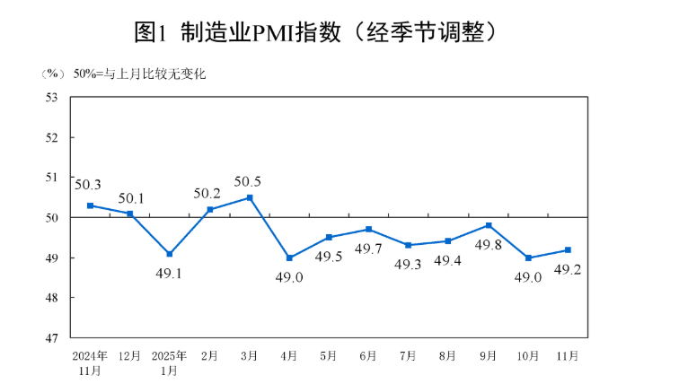 11月份,制造业采购经理指数(PMI)为49.2%,比上月上升0.2个百分点,景气水平有所改善。