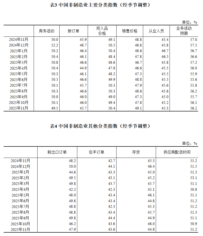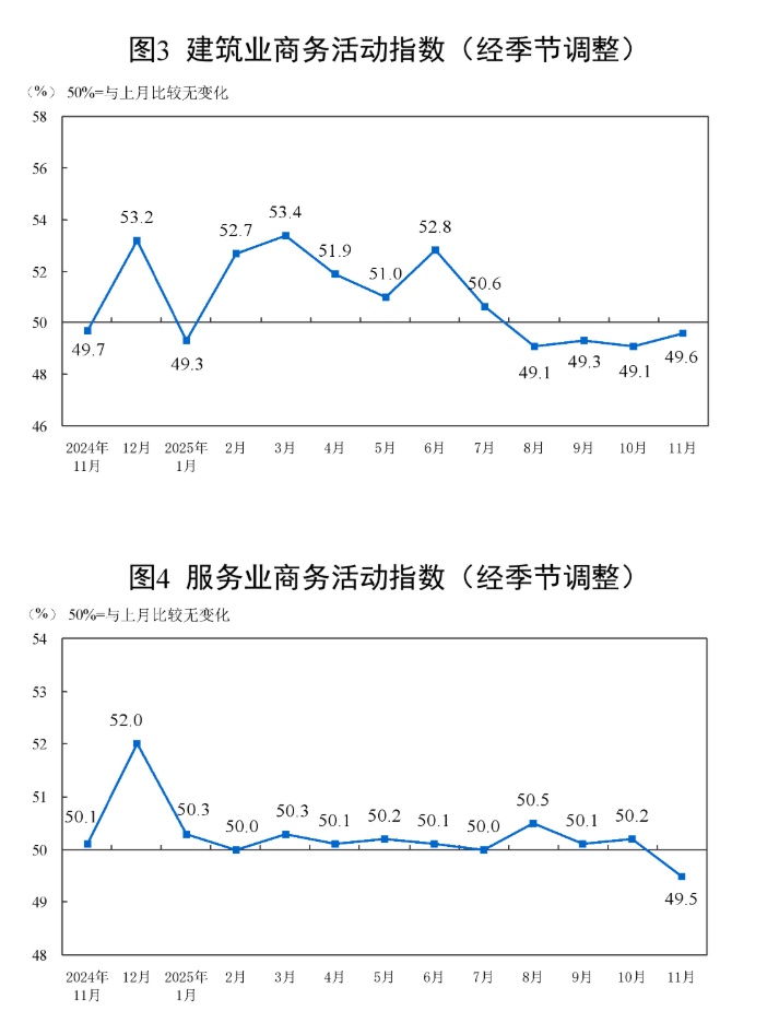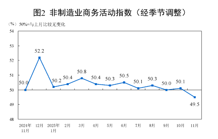 11月份,非制造业商务活动指数为49.5%,比上月下降0.6个百分点。
