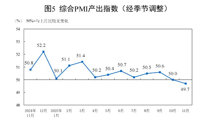 11月份,综合PMI产出指数为49.7%,比上月下降0.3个百分点。