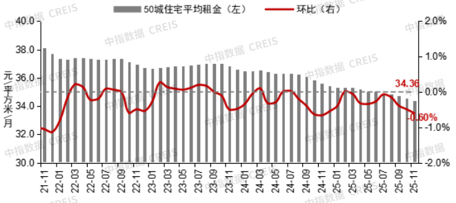 图:2021年11月至2025年11月50城住宅平均租金及环比变化