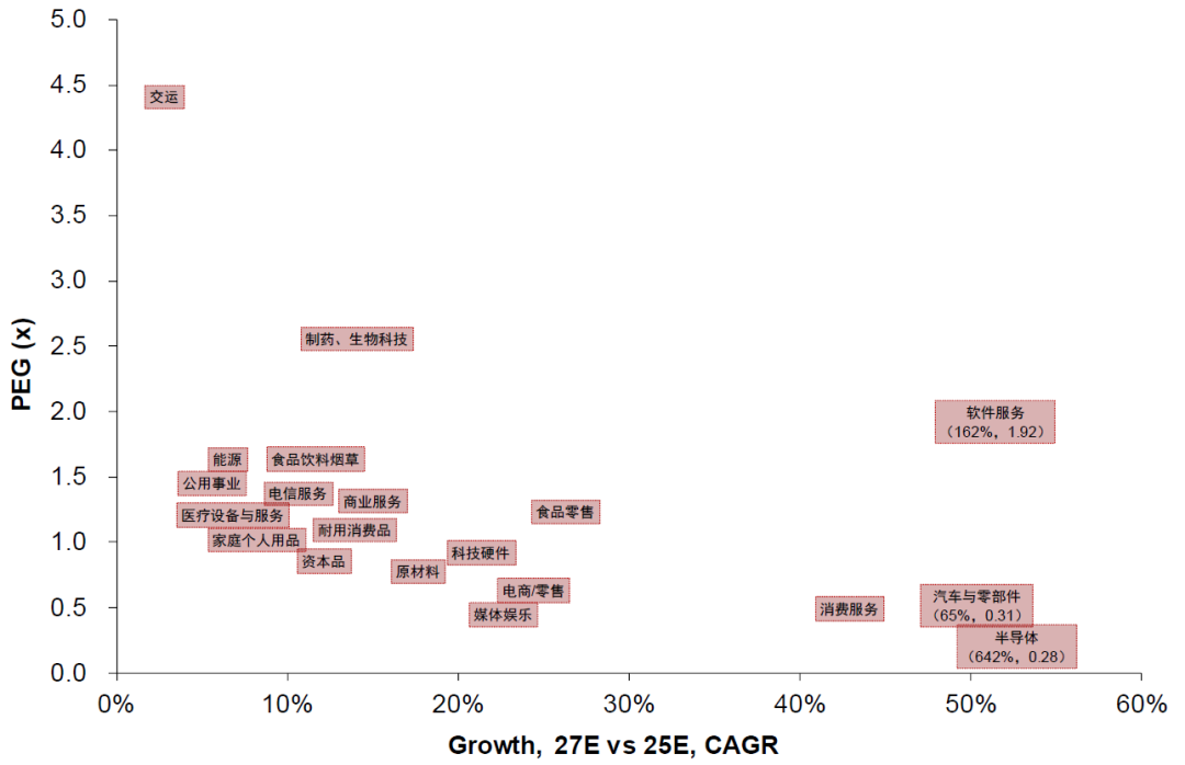 如何在AI板块内部择线?短期看硬件国产替代,长期看应用端需求与盈利兑现。当前市场对硬件(如MSCI中国半导体行业等)的业绩增长预期要高于应用板块(如MSCI中国软件、媒体娱乐等)(图表14)。差异的背后固然有业绩基数高低带来的较大计算结果不同,但也有国内政策发力、尤其是国产替代政策的因素,而这也是中国AI相关资产与美股AI板块最大的区别。长远来看,如果随着AI产业不断发展,应用端在未来出现了显著突破(如爆款级AI应用和货币化进展),则或将进一步打开中美AI软件板块的估值空间。