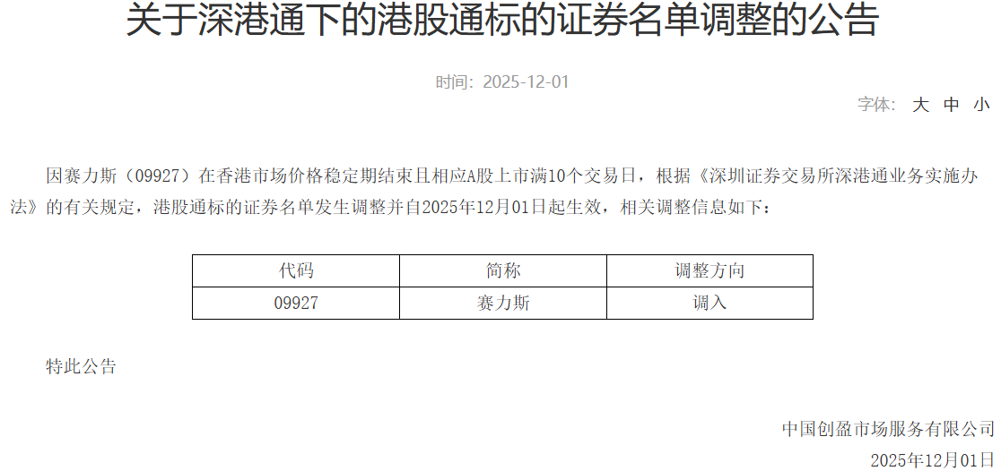 智通财经APP获悉,深交所公告,因赛力斯(09927)在香港市场价格稳定期结束且相应A股上市满10个交易日,根据《深圳证券交易所深港通业务实施办法》的有关规定,港股通标的证券名单发生调整并自2025年12月01日起生效,调入赛力斯。
