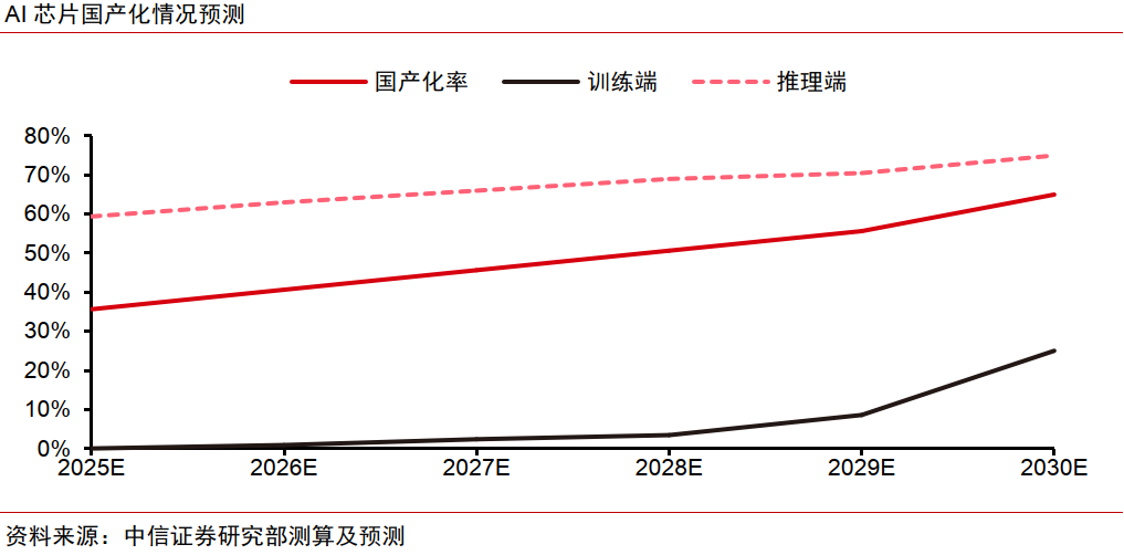 国产AI芯片:预计2030年的中国AI芯片市场规模将在2025年350-400亿美元基础上,增至原来的7-9倍,增幅高于全球。中国AI芯片国产化率有望从2025年30~40%提升至2030年的60~70%水平。