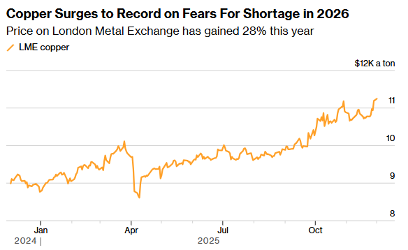 这些最新交易延续了今年铜市的动荡格局:年初,美国总统特朗普首次威胁加征关税后,美国铜价大幅飙升,引发全球铜资源向美集中流动。尽管特朗普最终豁免了精炼铜的关税,但表示将在2026年下半年重新评估这一决定。此后,一系列矿山生产中断导致供应收紧,推动全球铜价攀升至历史新高。