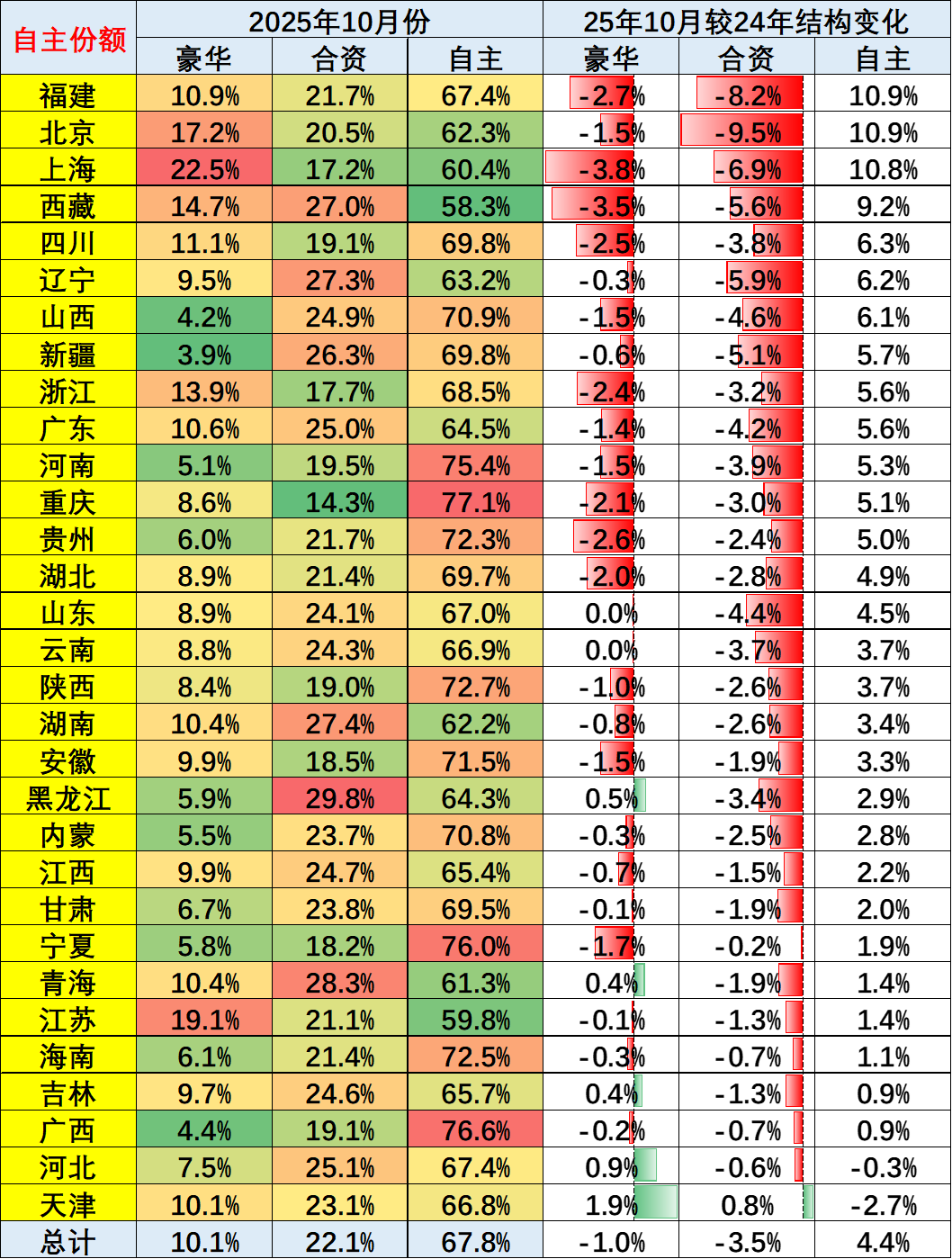 上海与北京的豪华车市场占比均是很高的,2025年自主快速发展,豪华车份额下降明显,而合资份额在大城市已经接近于豪华车份额,而且份额下降较快,体现了自主对合资的替代效果明显。