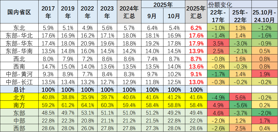 虽然在10月华东和中部黄河车市总体表现是月度相对较强,但是在年度表现来看,仍需要有效的观察。而且2024年跟2019年对比,东北和西北车市是中国车市增长最快的地区,而像南方地区总体表现相对较差。中西部车市好于东部车市,2025年中部地区车市份额较上年同期的份额增加1.2个百分点,而中部的长江地区车市有所回暖。